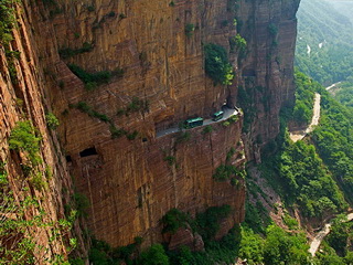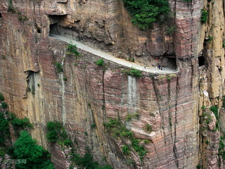 太行山由于地殼運(yùn)動形成了斷裂,幾乎是垂直而下,山谷往往是萬丈深淵。掛壁公路就是在這樣的絕壁上開鑿出來的。如今,就算是走在掛壁公路上,看看腳下不見底的深谷,都會不寒而栗,難以想象當(dāng)初郭亮村的村民是以何等的勇氣開鑿出了這樣一條人間奇跡!