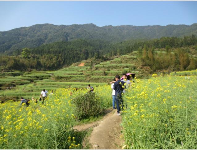 第二天上午我們乘車來到江西婺源江嶺,婺源歸來不看村,江嶺歸來不看花。江嶺,是國內(nèi)四大油菜花海之一,江嶺自然是婺源觀賞油菜花的首選之地。萬畝油菜花海在漫山遍野的梯田間肆意綻放。漫步于高低蜿蜒的觀景棧道,如同來到一片花的海洋。黃燦燦的花陣隨風(fēng)搖擺,就像一層層翻涌的波浪。在綿延起伏金黃花海之中,形成清新淳美的鄉(xiāng)村田園風(fēng)光,一派生趣盎然。