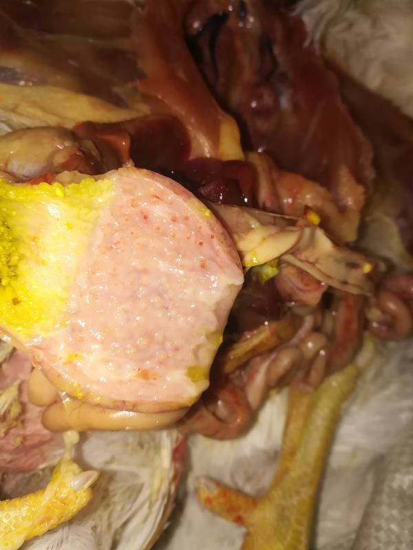 1.病原為霉菌和大腸桿菌時表現(xiàn)為:呼吸困難、消瘦、精神沉郁、排黃綠色稀便,感染嚴重的雞群死亡率很高,尤其是雛雞發(fā)病較多。剖檢可見腸道水腫,腸內(nèi)膜呈麩皮樣,氣囊、肺有霉斑。