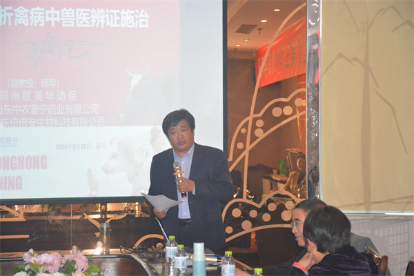 25日上午,第五屆中獸醫(yī)學(xué)習(xí)班在凱里亞德大酒店正式開始,公司技術(shù)總監(jiān)王金紀(jì)主持了本次學(xué)習(xí)培訓(xùn),并向大家介紹了本次活動(dòng)的授課嘉賓和日程安排。首先由公司技術(shù)顧問、行業(yè)著名專家、河北農(nóng)業(yè)大學(xué)史萬玉教授為大家?guī)砹恕秶鴺?biāo)中獸藥產(chǎn)品在禽病防治中的作用與應(yīng)用》的技術(shù)講座。史教授針對(duì)當(dāng)前養(yǎng)殖中面臨的常見疾病,從中醫(yī)角度對(duì)疾病的發(fā)病原因與預(yù)防治療措施等進(jìn)行了詳細(xì)講解。