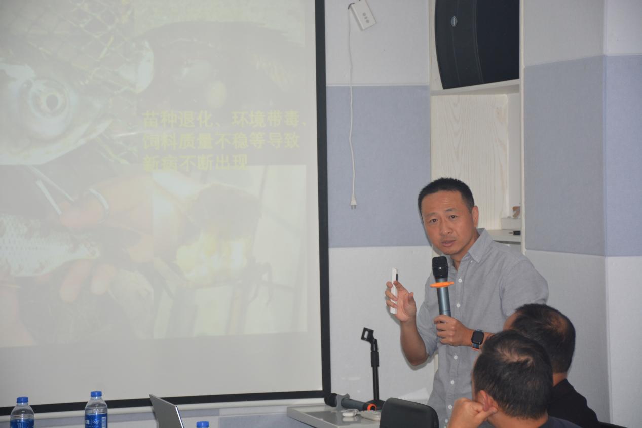 在銷售團(tuán)隊(duì)作完工作匯報(bào)后,公司技術(shù)顧問袁圣老師為參會(huì)人員作了精彩的技術(shù)報(bào)告。袁老師從全國(guó)水產(chǎn)養(yǎng)殖普遍存在的問題入手,不斷細(xì)化,用科學(xué)的數(shù)據(jù)和大量的現(xiàn)場(chǎng)診斷實(shí)例,為大家講解了養(yǎng)殖中存在的問題和常見疾病的診療方法。